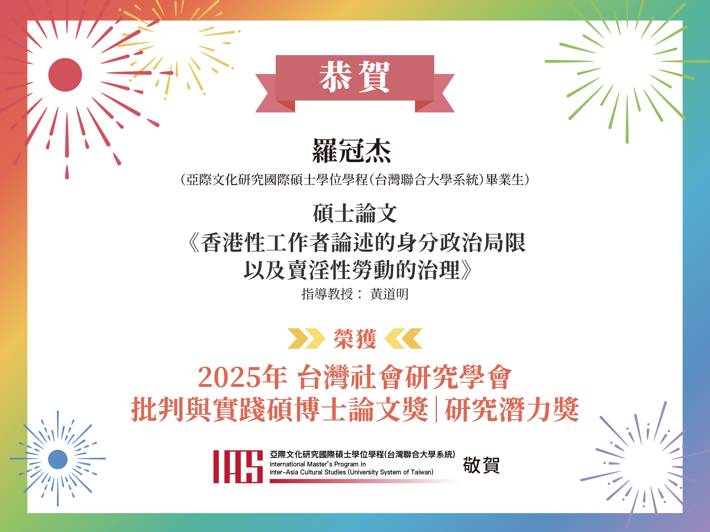 恭賀!學程學生羅冠杰 榮獲2025年台灣社會研究學會-批判與實踐碩博士論文獎