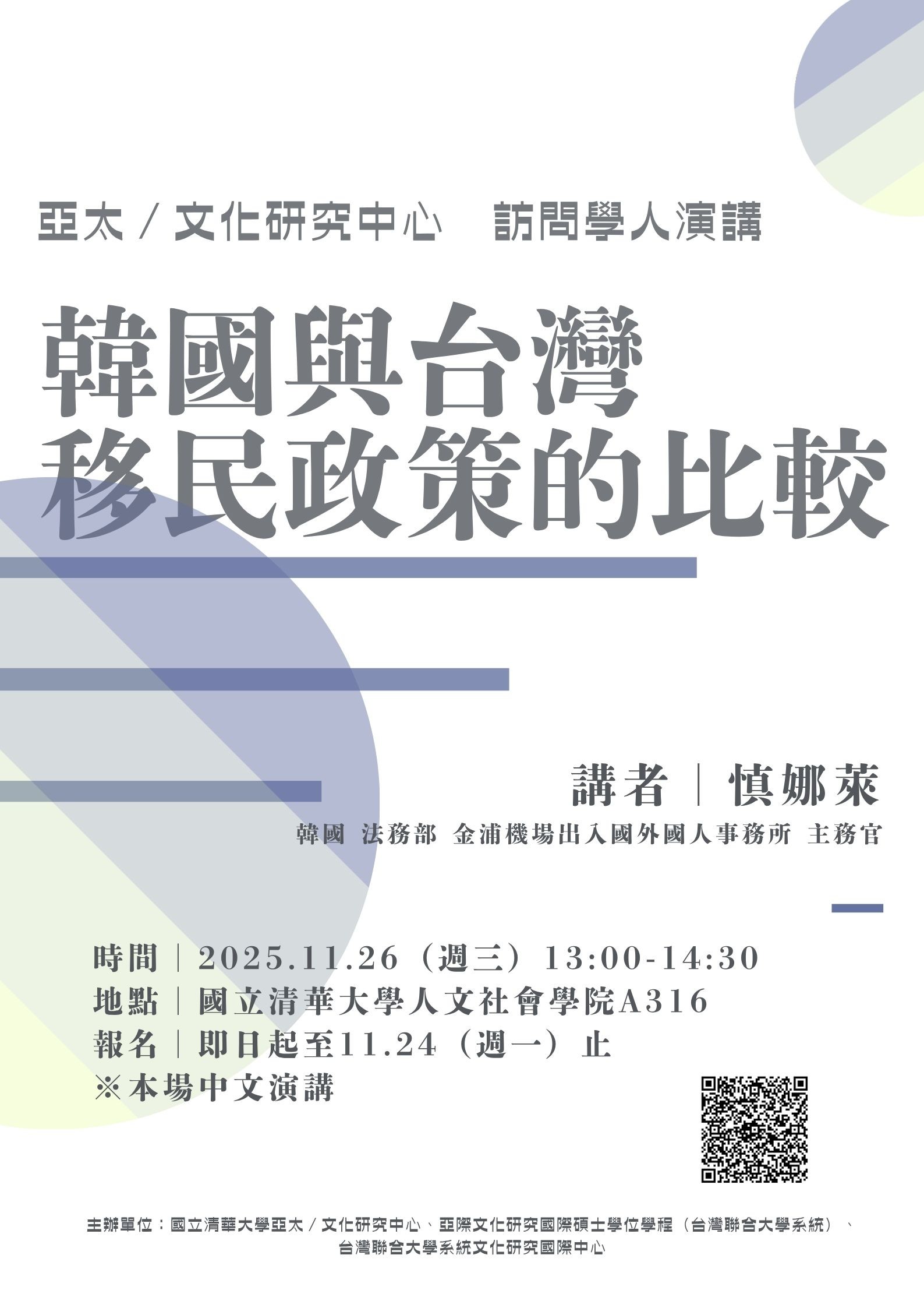 【講座/Speech】清大亞太/文化研究中心 114年度訪問學人演講:韓國與台灣移民政策的比較
